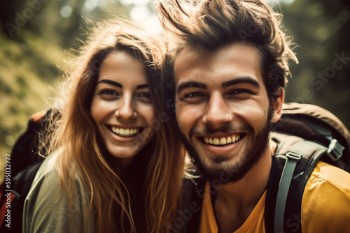 generative, ai, illustration, design, layout, template, graphic, concept, conceptual, hiking, trekking, mountain, forest, couple, man, woman, girl, female, male, person, people, adventure, active, activity, young, beautiful, lifestyle, pair, family, together, mood, vibe, smile, smiling, having fun, relax, relaxing