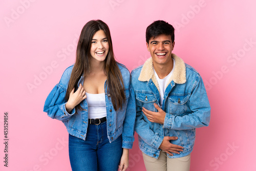 background, caucasian, colourful, date, expression, female, funny, gesture, girl, good, happiness, happy, isolated, laugh, laughing, lifestyle, love, man, partner, people, person, pink, positive, proud, human relationships, romance, romantic, smile, teenage, teenage, together, 2, valentine, woman, young, couple