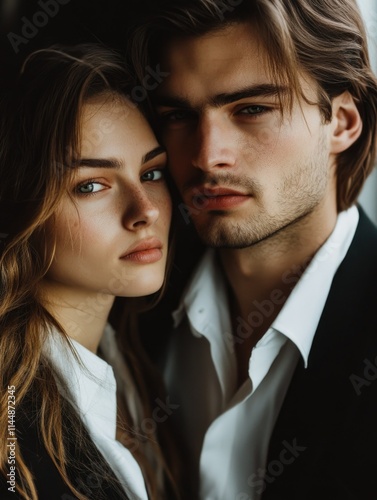 young, adult, romantic, human relationships, friendship, professional, portrait, social, media, profile, picture, promotional, image, suit, attaching, fashionable, attire, modern, clothing, style, casual attire, hugs, neutral, expression, posing, camera, blurred, background, sharpened, subject, flash, indoor, setting, personal, connection, post, modelling, agency, portfolio, realistic, photo, emotional, engagement, creative, sophisticated, appearance, lifestyle