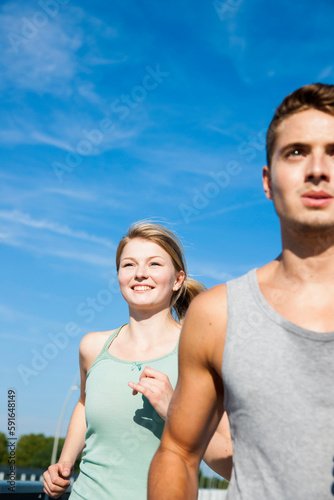 outdoors, daytime, sunshine, female, exercise, sport, woman, brunette, caucasian, man, structure, life, smile, partnership, human relationships, human, active, running, image, runner, european, couple, boyfriend, girlfriend, person, bottom, living, picture, german, 2, photograph, jog, youngster, humanity, 20, jogger, worm, fair-haired, long-haired, german, ponytail, low angle, tank top, missy, two people, copy space, cardio