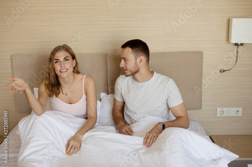 couple, bed, woman, bedchamber, home, love, happy, family, people, young, beautiful, husband, human relationships, happiness, wife, white, married, boyfriend, girlfriend, smiling, divorce, lifestyle, lover, 2, lying, brown, caucasian, discussing, discussion, female, hair, indoor, male, man, person, portrait, problem