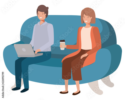 young couple using laptop in the sofa avatar character