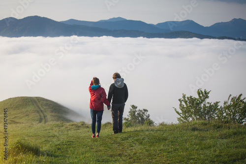 couple, pair, mountain, sunrise, walking, romantic, fog, morning, hand, holding, 2, woman, misty, cloudscape, man, cloud, family, happy, leisure, along, freedom, looking, hill, standing, haze, hiking, human relationships, love, vale, back, journey