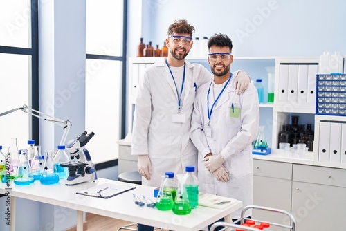 Young couple wearing scientist uniform hugging each other at laboratory