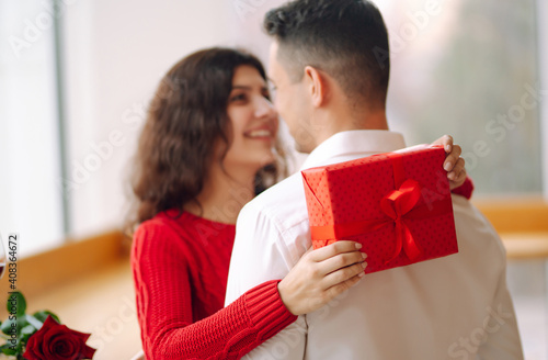 Young couple with gift box hugging and celebrating Valentine's Day. Relationship, holiday, surprise and love concept.