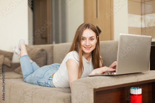 Young cute smiling woman with laptop looking at camera while lies on sofa in living room