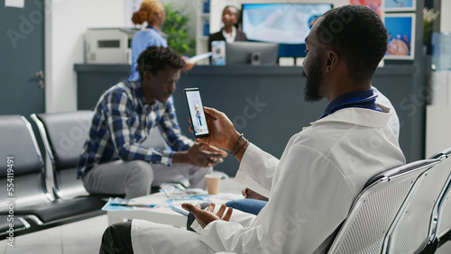 conference, teleconference, video, call, remote, chat, online, smartphone, webcam, hospital, waiting room, waiting, room, area, reception, lobby, medicine, report, clinic, health, center, check-up, visit, consultation, exam, health care, appointment, treatment, diagnosis, patient, nurse, medicals, general, practitioner, doctor, specialist, physician, medic, people, woman, man, disease, technology, african american, black