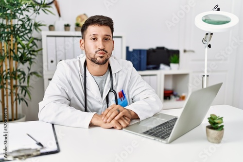 Young doctor working at the clinic using computer laptop puffing cheeks with funny face. mouth inflated with air, crazy expression.