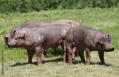 Young duroc pig herd grazing on farm field summertime