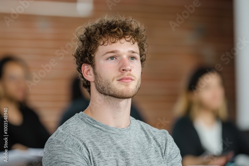 Young entrepreneur sharing his story at a workshop, the audience listening intently and taking notes, Generative AI