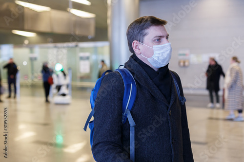 man, corona, virus, aerodrome, mask, backpack, suitcase, afraid, wheel, passenger, blue, caucasian, china, chinese, coat, crowd, custom, dangerous, disease, disposable, epidemic, european, face mask, flu, flu epidemic, frightened, health care, disease, infection, flu, medicals, pneumonia, protection, protective, public, respiratory, safety, sick, transport, transportation, travel, underground, young, 2019