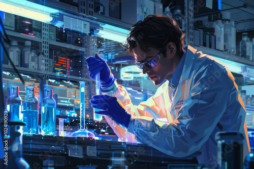 young European scientist, fully engaged in his scientific experiment. meticulously transferring