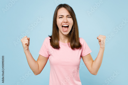 Young excited happy caucasian woman 20s in pink t-shirt doing winner gesture celebrate clenching fists say yes isolated on pastel plain light blue background studio portrait. People lifestyle concept.