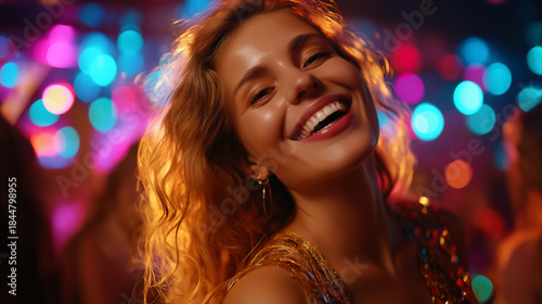 Young faceless woman celebrating fun night out in nightclub filled with colorful lights upbeat music and lively atmosphere reflecting youthful energy and party vibes, with copy spa
