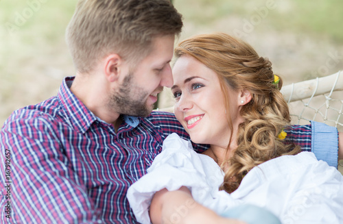 Young family couple having picnic on the beach near the sea, drinking tea and relaxing in the hammock in summer nature