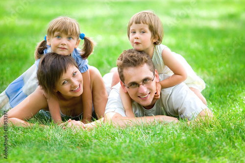 man, father, father, woman, female, mother, family, eltern, relative, children, daughter, girl, children, children, children, human relationships, together, togetherness, love, loving, people, group, happy, smiling, smile, happiness, fun, cheerful, bonding, childhood, day, 2, 4, outdoors, grass, park, lawn, outside, laughing, parenthood, young, relaxation, lying down, hugging, hugs, carrying, embracing, piggyback