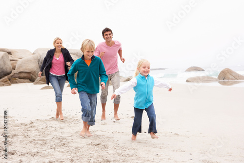 Young Family Running Along Winter Beach