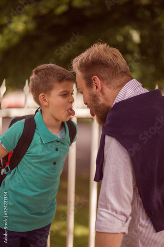 young father and his little son, making a face to each other. Tongue out, face to face.