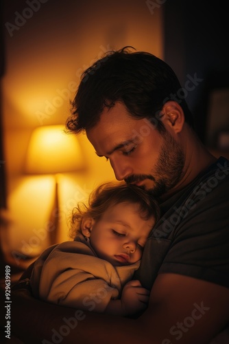 father, daughter, baby, sleeping, love, family, home, night, bedchamber, holding, care, tenderness, childhood, innocence, eltern, parenthood, fatherhood, bonding, connection, warmth, security, peace, calmness, cosy, intimate, lamplight, soft, sharpened, close, up, indoor, time, gold, light, dark, affectionate, hugs, serene, peaceful, bedtime, lullaby