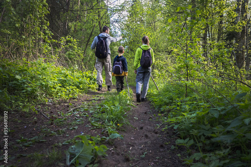 Young father with two children with backpacks and sticks walk along forest path in summer. Family weekend outdoors in woods, camping. Hiking with kids, healthy lifestyle. Social distancing together