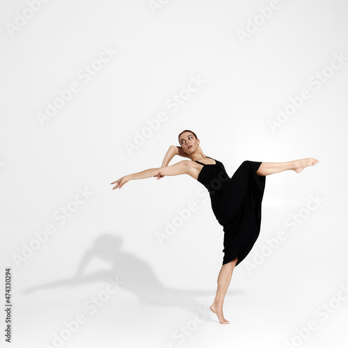 girl, white background, studio, young, caucasian, woman, background, white, lifestyle, barefoot beach, beautiful, european, modern, attractive, fit, pretty, elegant, sporty, sportive, elegance, dance, slim, ballerina, ballet, dancer, red hair, art, classic, classical, choreography, artist, style, shadow, balance, body, concentrated, professional occupation, profession, flexibility, performance, action, looking away, hobby, leisure, entertainment, performer, dancing, black dress