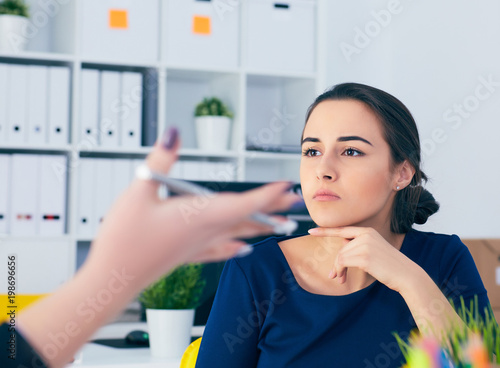 Young female colar smiling during meeting in office conference room. Team work concept.