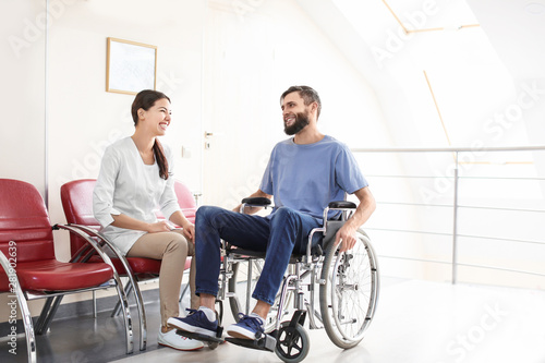 Young female doctor taking care of man in wheelchair indoors