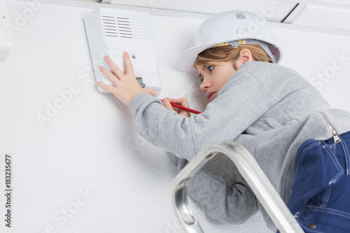 female, technician, ladder, professional, electrician, standing, caucasian, young, ceiling, install, profession, installing, successful, guy, indoor, white, woman, installer, career, person, tool, people, fixing, job, men at work, industry, installation, home, helmet, smile, happy, stepladder, 20s, repairing, system, confident, repairman, photogenic, portrait