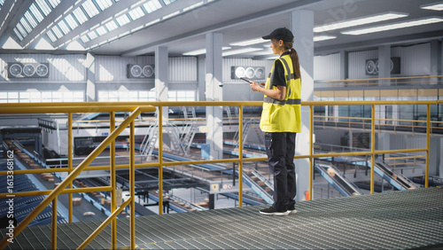 Young Female Standing on a Metal Platform, Using a Tablet Computer at a Post Office Logistics Center. Specialist Working at a Sorting Facility, Configuring the Automation Process