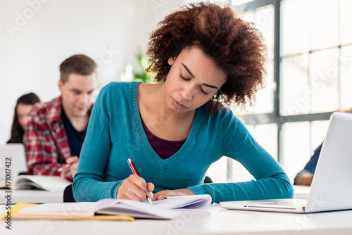 Young female student with a serious facial expression concentrating while writing an essay, during class in an international university