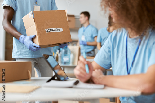 Young female volunteer in blue uniform making notes while working on donation project. Team sorting, packing items in cardboard box in the background