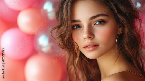 young, female, wavy, hair, pink, balloon, elegant, expression, beauty, portrait, closeup, soft, glow, make-up, lip, eye, charming, delicate, coiffure, earring, fashion, glamour, serene, youthful, vibrant, natural, contemporary, stylish, graceful, warm, lighting, background, composition, model, skin, attractive, confident, gentle, high-coloured, pretty, peaceful, face, cheerful, artistic, trendy