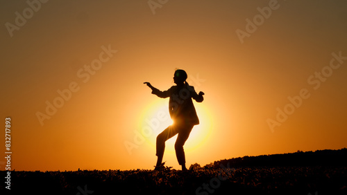woman, dancing, person, field, dance, businesswoman, rejoice, celebrate, victory, success, happy, satisfied, guitar, winning, have fun, healthy, business, man, people, farmer, rural, landscape, nature, active, lifestyle, activity, emotion, emotional, cheerful, men at work, deal, party, girl, summer, female, happiness, sun, joy, fun, freedom, meadow, sunset, silhouette, twirling