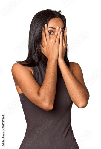 Young Filipina with long black hair in studio blink through fingers frightened and nervous.