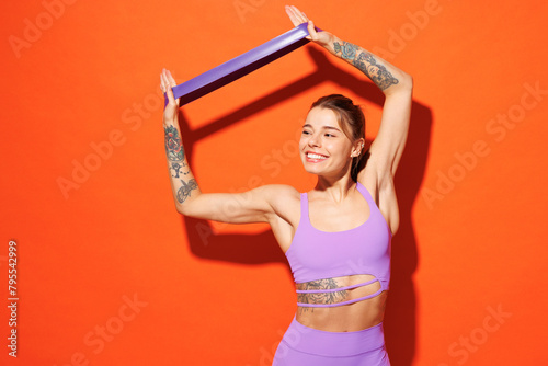 Young fitness trainer instructor sporty woman sportsman wear purple top clothes in home gym hold elastic rubber band raise up hands isolated on plain orange background. Workout sport fit abs concept.