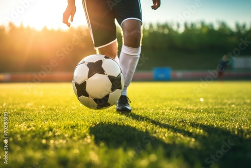 Young football player plays with sport ball on the modern football pitch during sunset. Generative Ai.