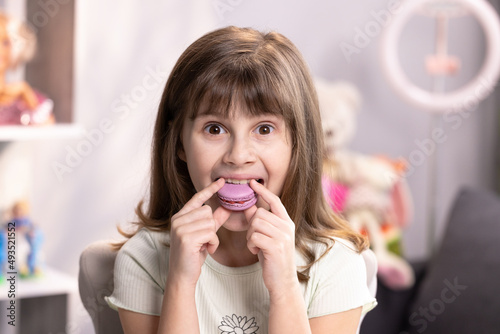 Young fresh and beautiful brunette kid girl smiles, thinks about something, looks on small macaron cookie in her hand and bites it