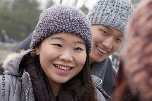 vertical, three people, young men, missy, smiling, laughing, talking, foulard, cap, warm clothes, casual clothes, beijing, china, outdoors, day, winter, happiness, enjoyment, friendship, fun, play, bonding, togetherness, carefree, hanging out, selective focus, portrait, color image, photo