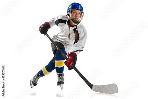 Young girl, athlete, hockey player in motion, training, playing isolated over white background. Championship. Concept of professional sport, competition, game, action and hobby