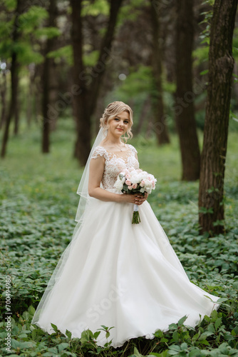 young girl bride in a white dress in a spring forest