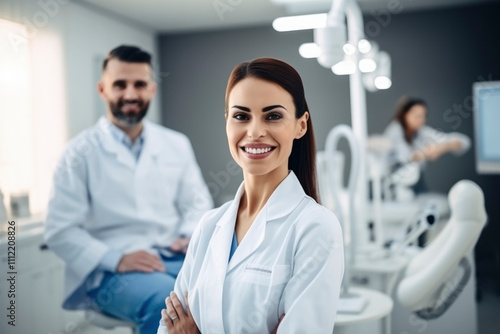 Young girl dentist in medical clothes smiling and looking at camera against background of dentist chair in clinic office. Dental health concept, treatment, orthodontists, medicine