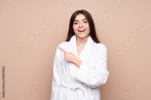 Young girl in a bathrobe over isolated background pointing finger to the side