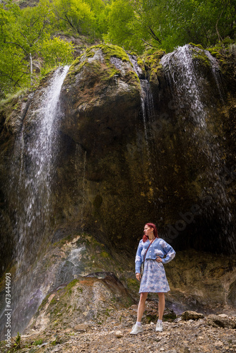Young girl in blue dress standing under beautiful Chegem waterfalls, Caucasus, Russia