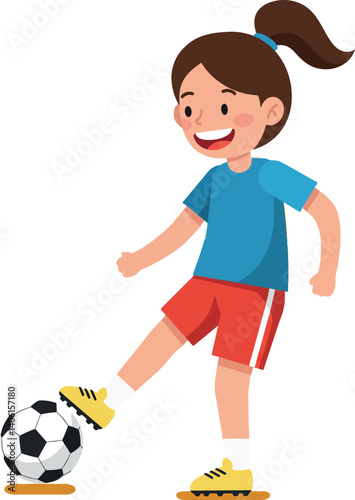 Young girl in blue shirt joyfully kicking a soccer ball in flat vector art