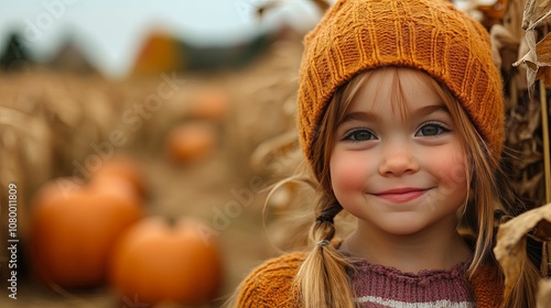 girl, young, children, smiling, happy, face, eye, hat, orange, knit up, cornfield, autumn, fall, field, corn, leaf, brown, blond, hair, sweater, red, pink, cheek, nose, mouth, joyful, cute, portrait, outdoors, nature, season, october, november