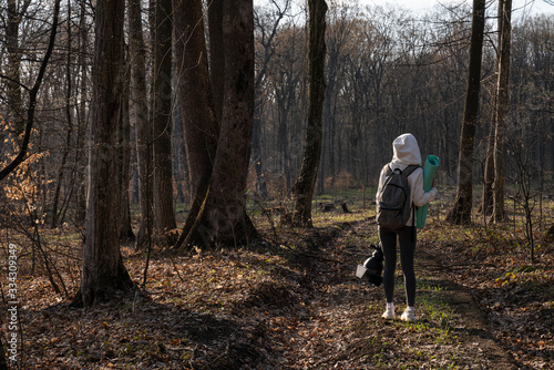 Young girl in sportswear with with grey backpack stands among the forest and dirt road and holding blue yoga mat