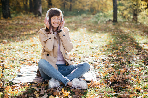Young girl listening to music with headphones in the autumn forest. The girl is in a great mood and happy