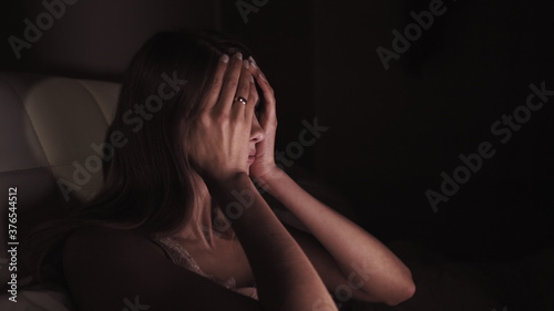 Young Girl lying on a sofa with a laptop and yawns few times. Trying to work at night. Girl with long hair and wear a white shirt. Legs are covered with a plaid