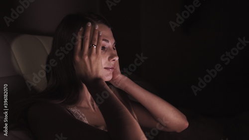 Young Girl lying on a sofa with a laptop and yawns few times. Trying to work at night. Girl with long hair and wear a white shirt. Legs are covered with a plaid