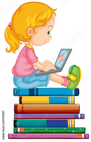 young, girl, laptop, blond, book, reading, studying, play, playing, study, learn, learning, happy, children, children, pink, blue, eye, student, green, book, illustration, graphic, picture, clip art, clip art, clip, art, background, drawing, image, vector